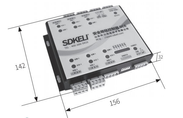 SC6型安全地毯控制器使用 Φ5.5螺钉安装在电器柜或墙壁上,其尺寸如下图所示
