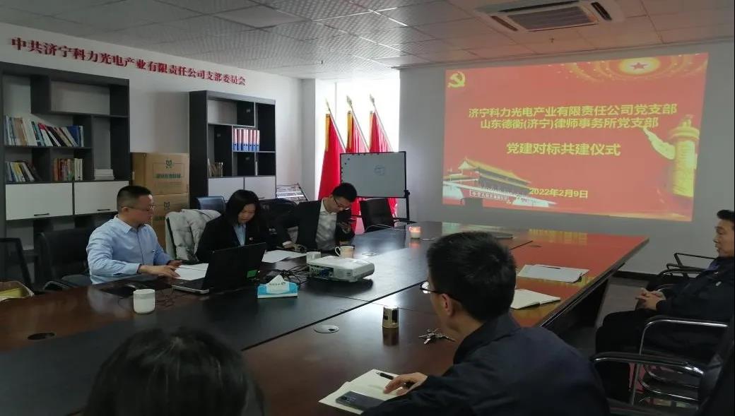 2月9日,济宁科力光电产业有限责任公司党支部与山东德衡(济宁)律师事务所党支部开展党建结对共建活动。结对仪式前,德衡律师事务所现场开讲法律知识专题讲座。